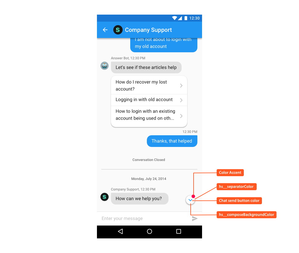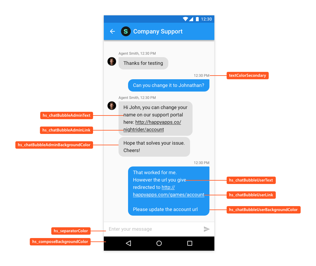 The following illustrates use of these styleable attributes over Helpshift SDK's UI: