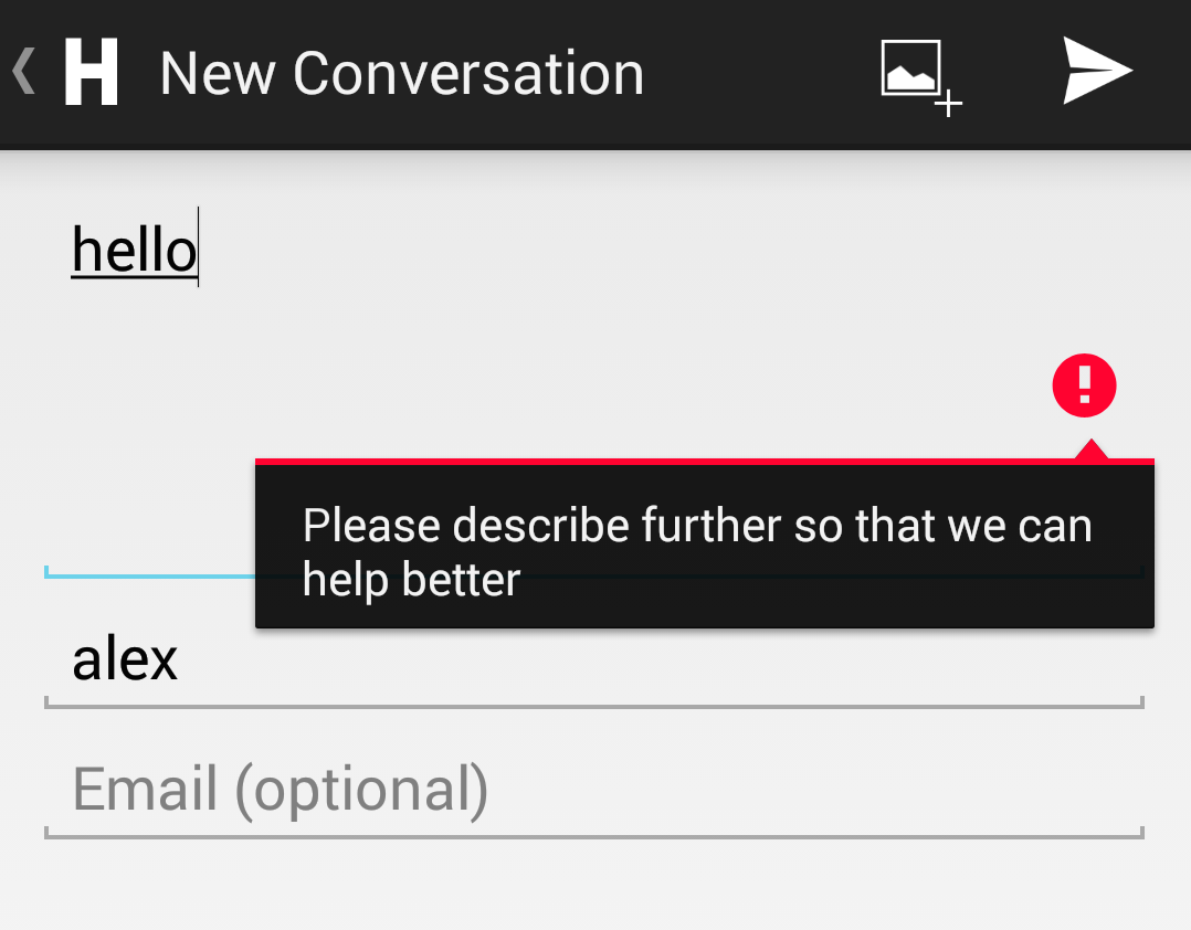 hs__description_invalid_length_error | Text for alertdialog displayed when the user tries to submit the ticket with issue text length less than the minimum required length. ![]() | Please describe further so that we can help better |